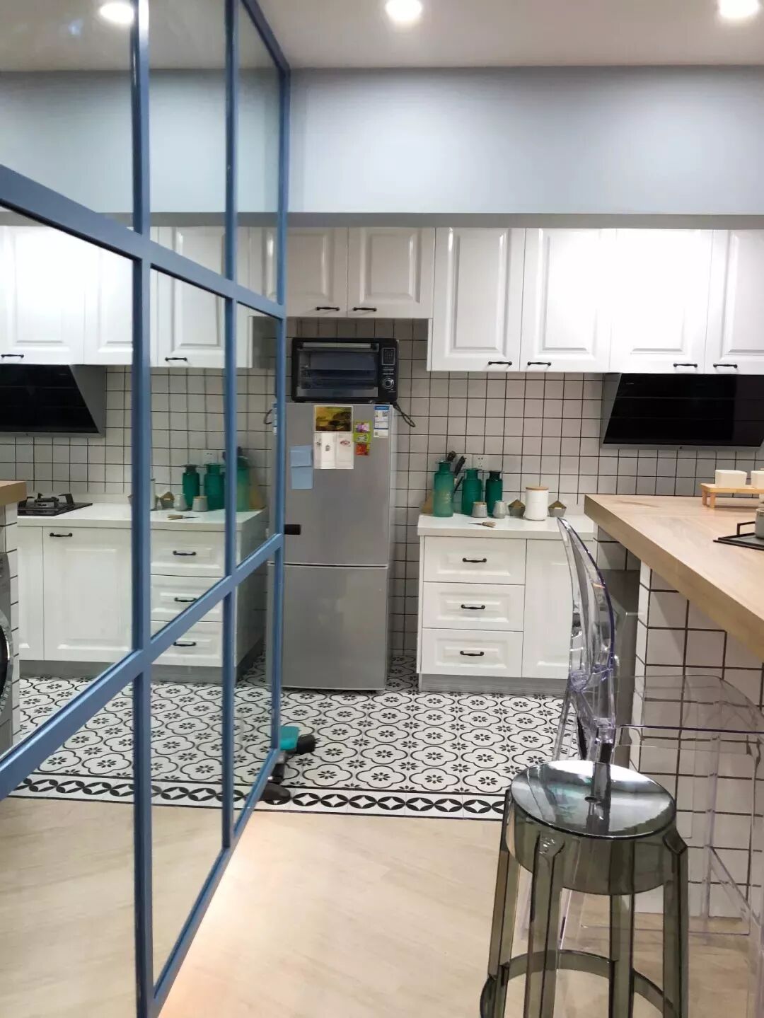 像这种完全由透明玻璃门隔出来的厨房空间